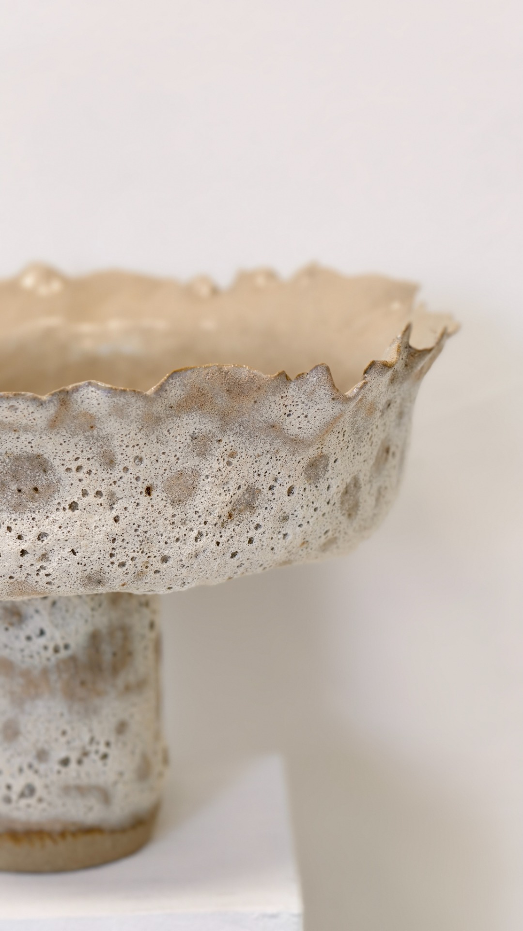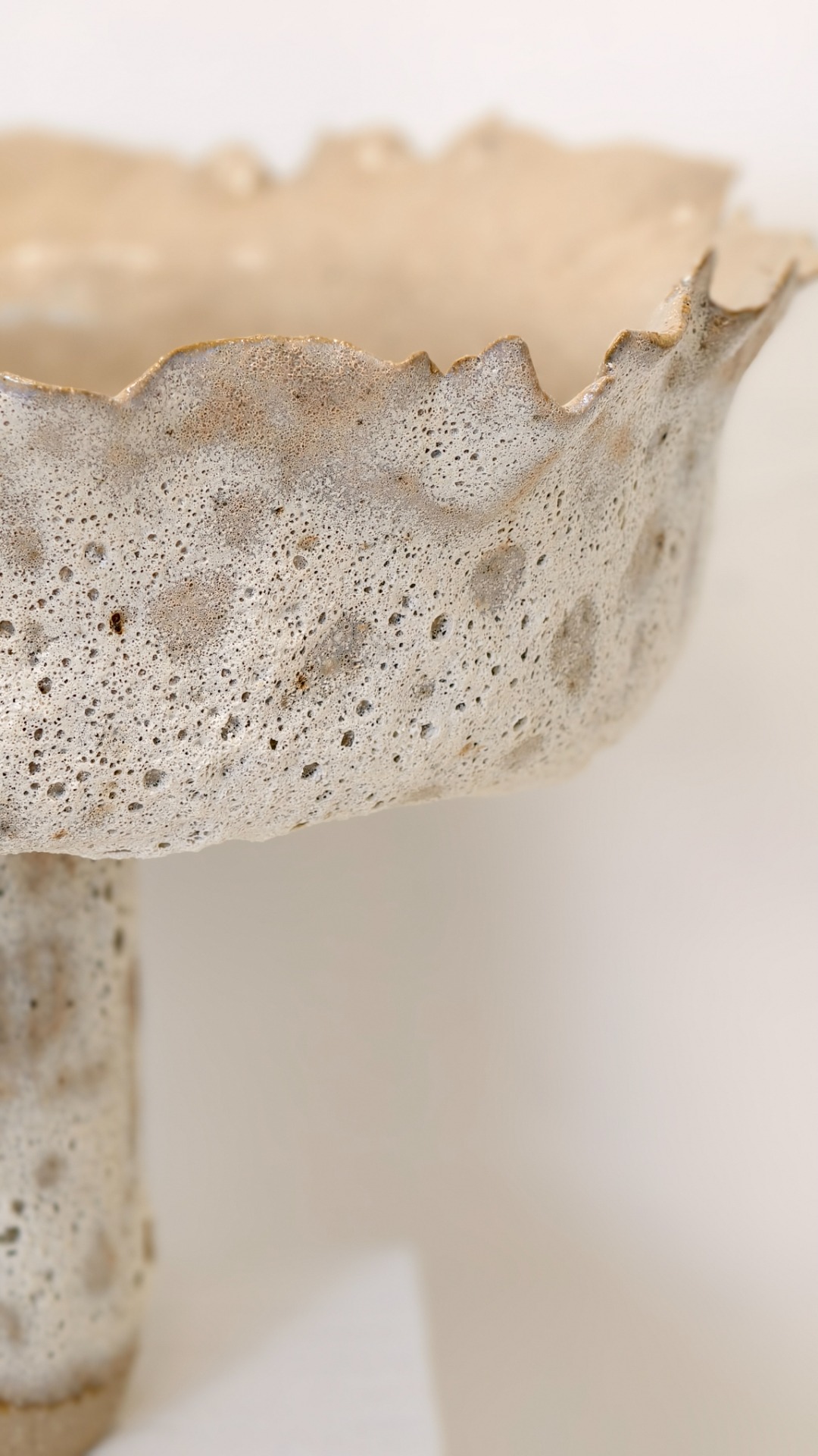 It is made from beige stoneware with a lava-effect surface — raw, organic, as if shaped by nature itself.