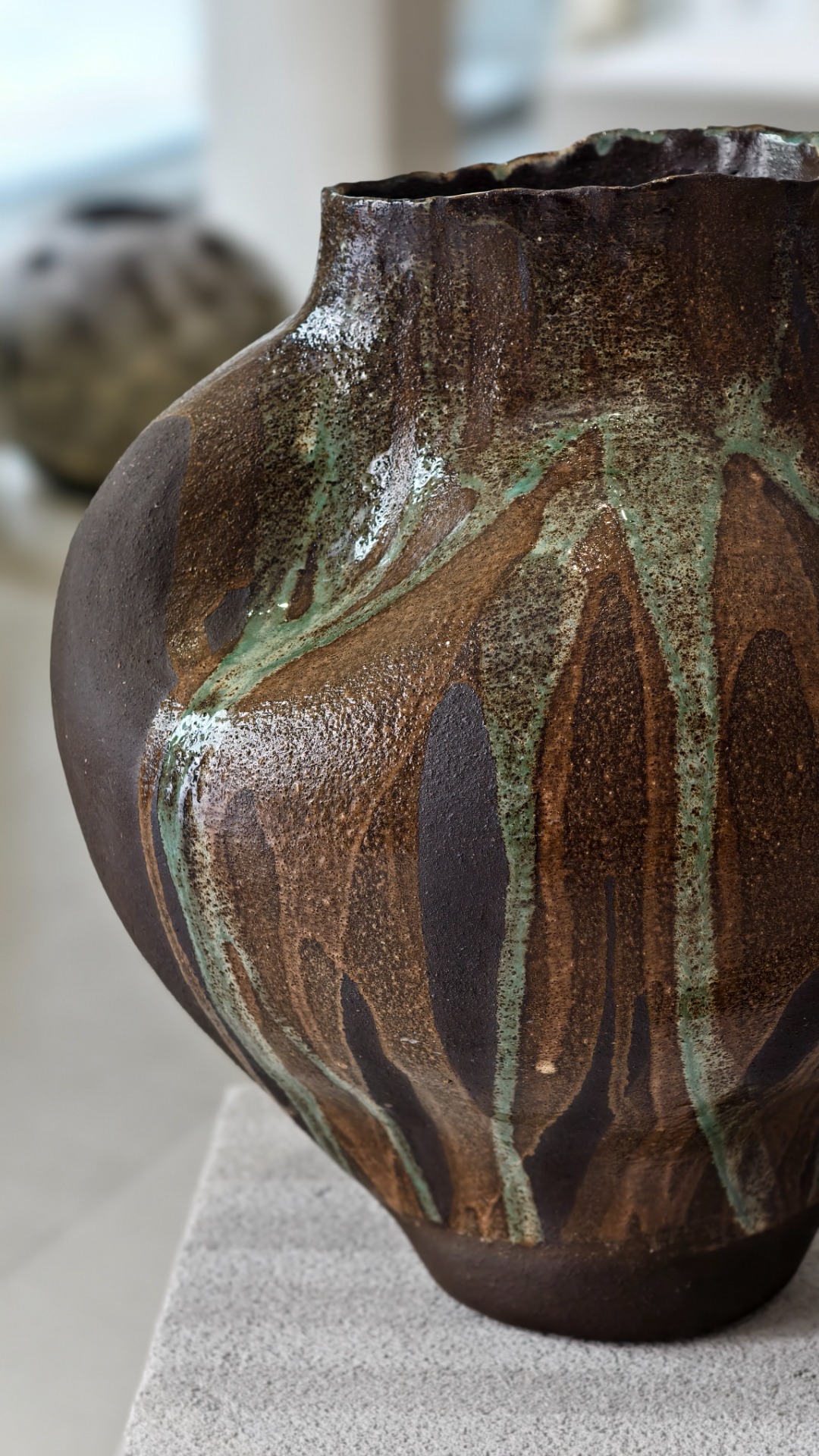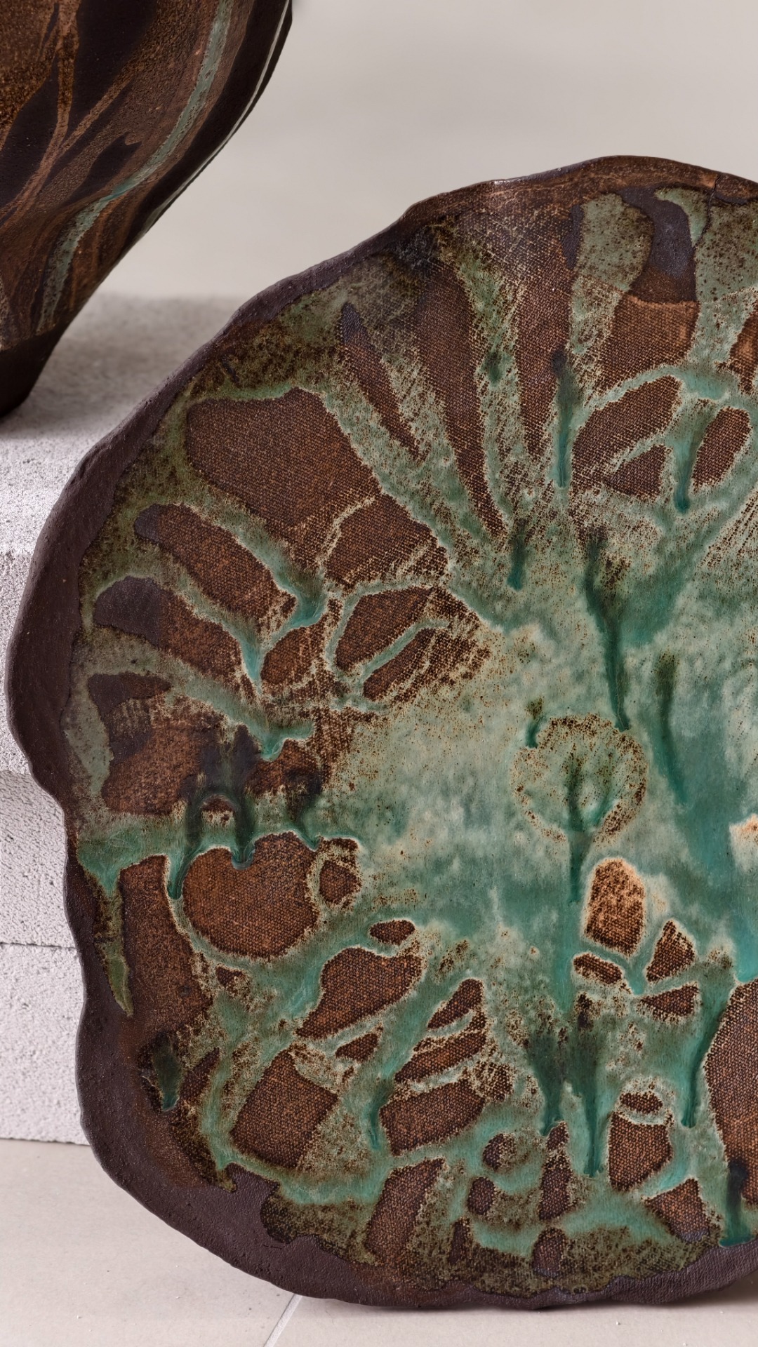 Ručne vymodelovaná váza + misa, ktoré sú svojou štruktúrou vhodné ako dizajnový doplnok do interiéru.
